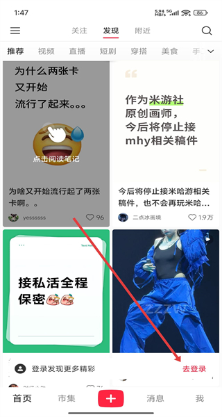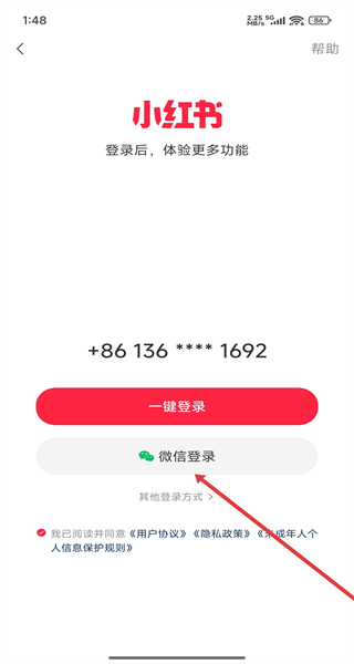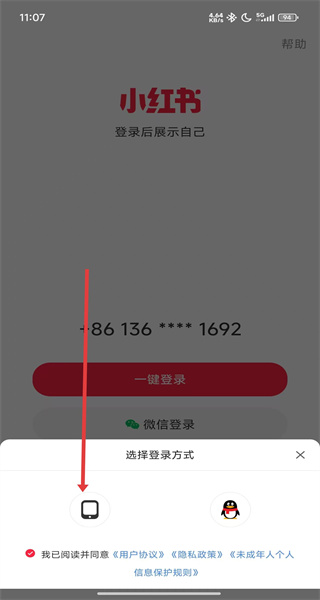 1、在進(jìn)入到小紅書登錄頁面中,可以點(diǎn)擊下方手機(jī)圖標(biāo),使用手機(jī)號進(jìn)行登錄。