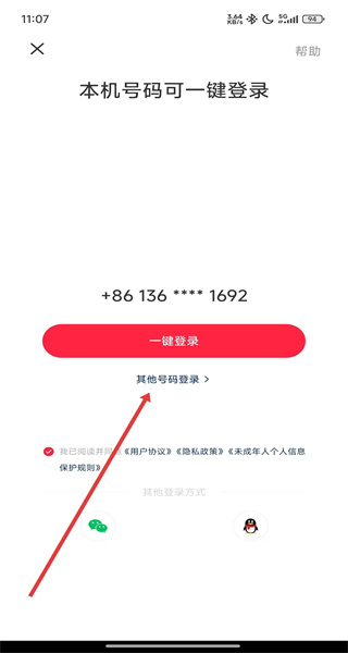 2、在進(jìn)入到本機(jī)號碼一鍵登錄頁面中,可以點(diǎn)擊下方其他號碼登錄按鈕,切換登錄方式。