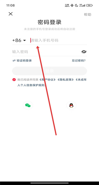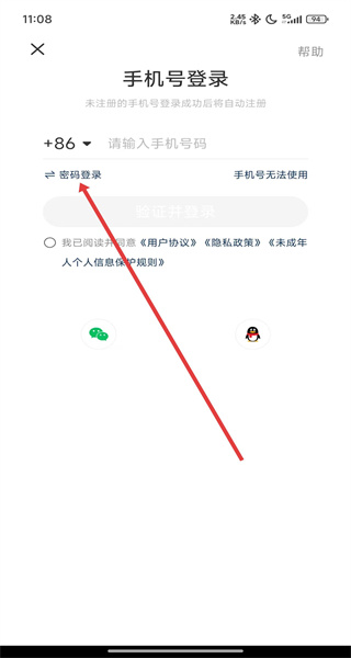 3、在切換到手機(jī)號驗(yàn)證碼登錄方式后,可繼續(xù)點(diǎn)擊下方密碼登錄按鈕,切換為密碼登錄。