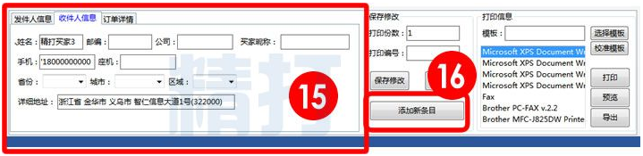 在⑪中選中一個(gè)或者多個(gè)訂單,選中一個(gè)快遞單模板和打印機(jī),點(diǎn)擊打印,即可輸出打印內(nèi)容了。