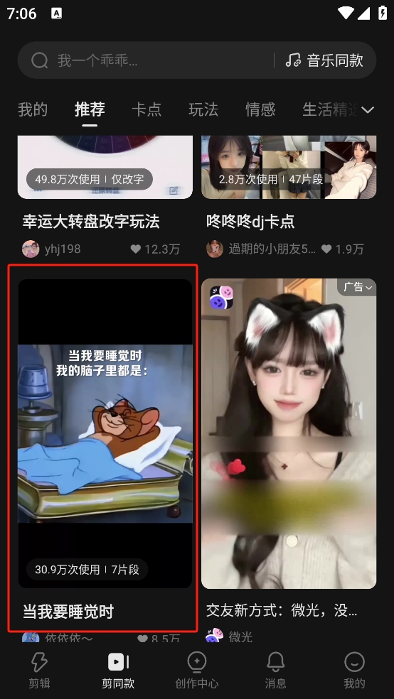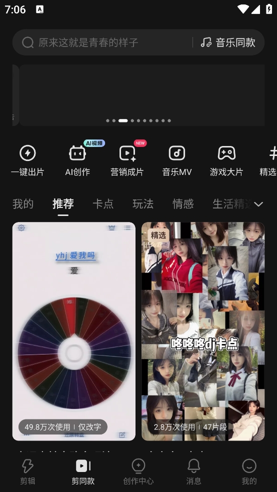 1、進(jìn)入頁面找到剪同款,可以看到有多重不同類型的視頻風(fēng)格,卡點(diǎn)、玩法、情感等;