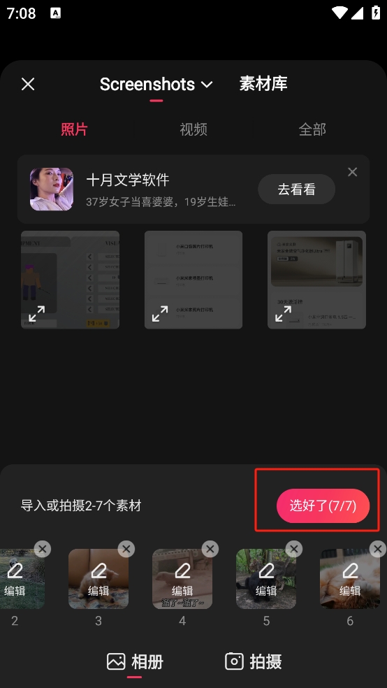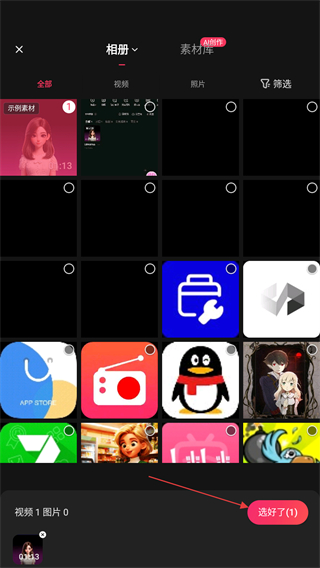 4、根據(jù)需要的放入的素材數(shù)量,點(diǎn)擊想要放入視頻內(nèi)的圖片或者視頻都可以;