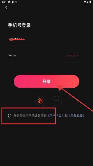 3、選擇后,輸入需登錄的手機(jī)號碼,獲取并填寫短信驗(yàn)證碼,勾選用戶協(xié)議和隱私政策,再點(diǎn)擊登錄按鈕。