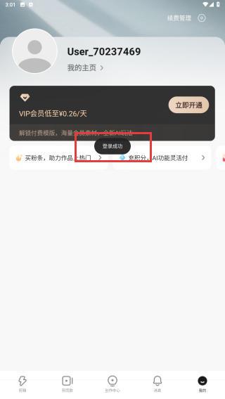 4、登錄成功后,頁面會顯示登錄成功提示,同時(shí)進(jìn)入個(gè)人主頁,即可使用快影的賬號關(guān)聯(lián)功能。