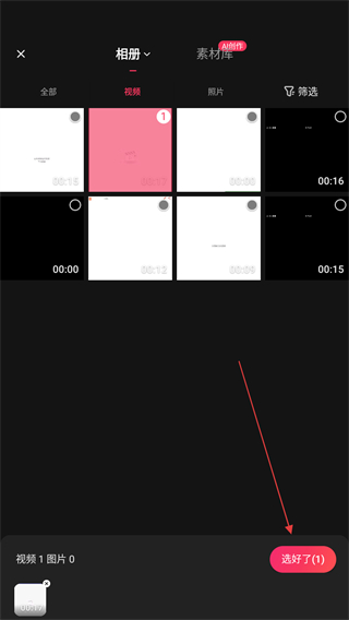2、進(jìn)入視頻選擇的頁面內(nèi),選擇后點(diǎn)擊選好了的按鈕。