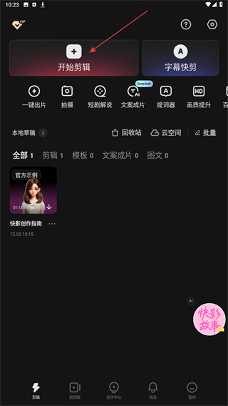 1、打開快影的應(yīng)用APP,進(jìn)入時(shí)點(diǎn)擊開始剪輯的按鈕。
