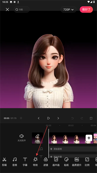 3、進(jìn)入剪輯的頁面內(nèi),點(diǎn)擊下方特效的按鈕。