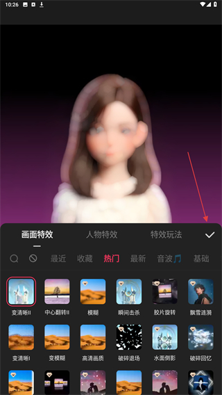 4、選擇好畫面特效后,點(diǎn)擊右上方打鉤的圖標(biāo)。