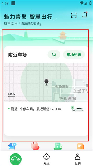 4、在主界面查看附近車場(chǎng)區(qū)域,查看附近停車場(chǎng)信息。