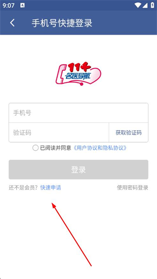 3、在手機(jī)號(hào)快捷登錄頁(yè)面點(diǎn)擊快速申請(qǐng),進(jìn)入會(huì)員申請(qǐng)頁(yè)面。