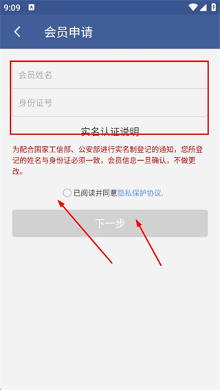 5、在會(huì)員申請(qǐng)的實(shí)名認(rèn)證頁(yè)面,填寫會(huì)員姓名和身份證號(hào),勾選協(xié)議,點(diǎn)擊下一步。