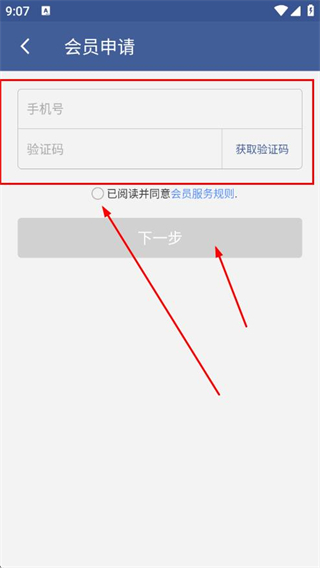 4、在會(huì)員申請(qǐng)頁(yè)面輸入手機(jī)號(hào),點(diǎn)擊獲取驗(yàn)證碼并填入,勾選服務(wù)規(guī)則,點(diǎn)擊下一步。