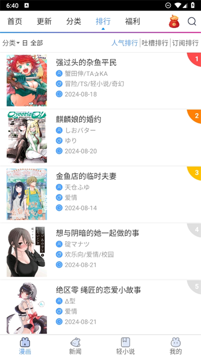 4、如何不知道看什么漫畫好,可以在排行榜中看看別人喜歡看哪些漫畫,直接單擊即可觀看漫畫了。