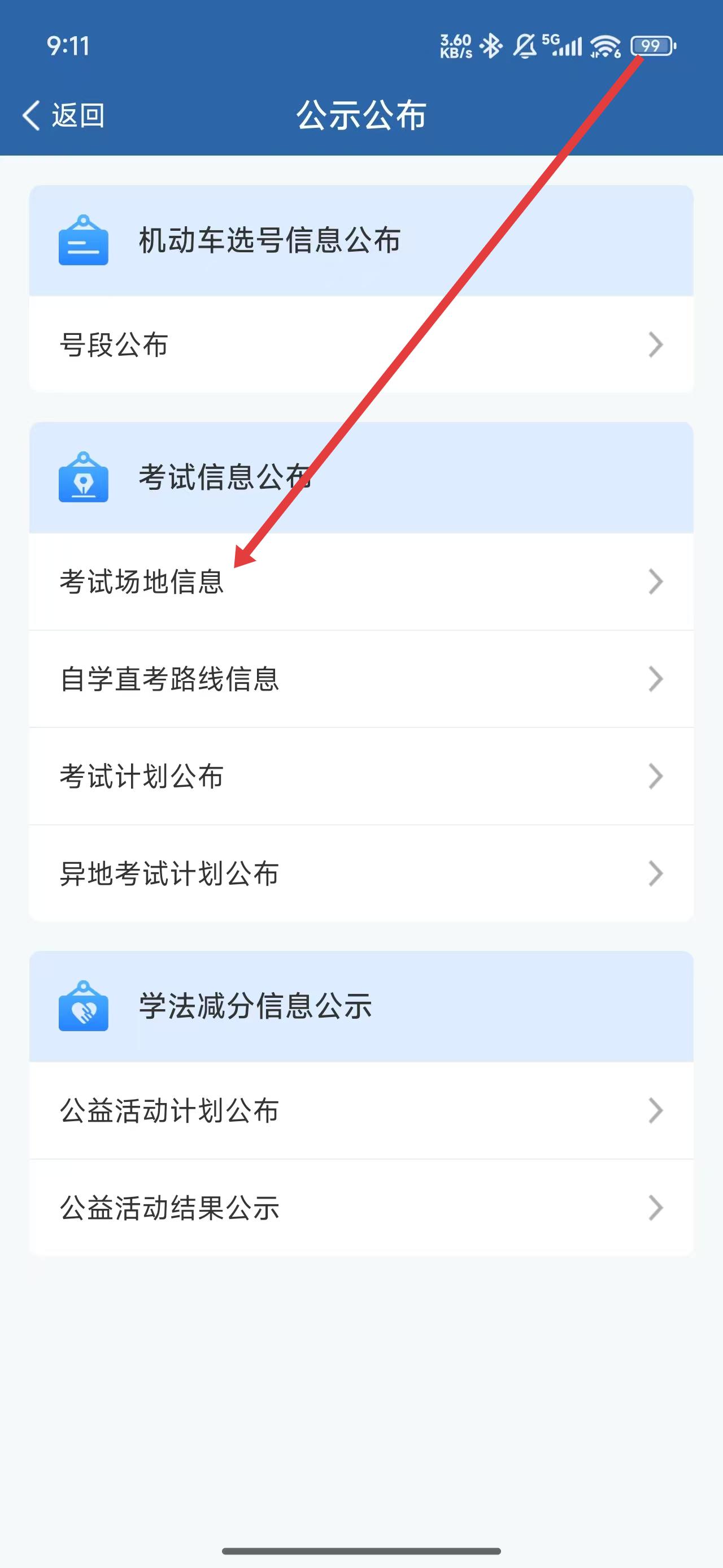 1、在公示公布頁面中,可以點(diǎn)擊考試場地信息選項(xiàng),進(jìn)入查看。