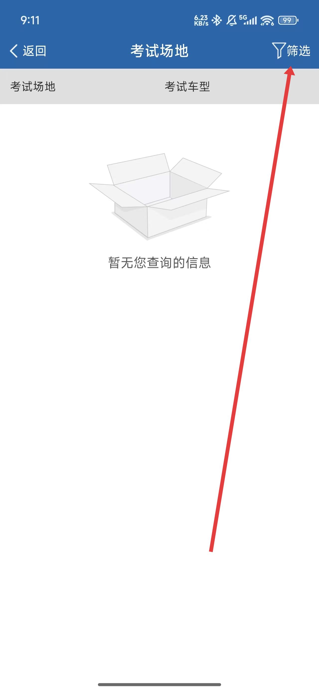 2、在進(jìn)入到考試場地頁面中,若顯示暫無信息,可以點(diǎn)擊右上方的篩選按鈕進(jìn)行篩選。