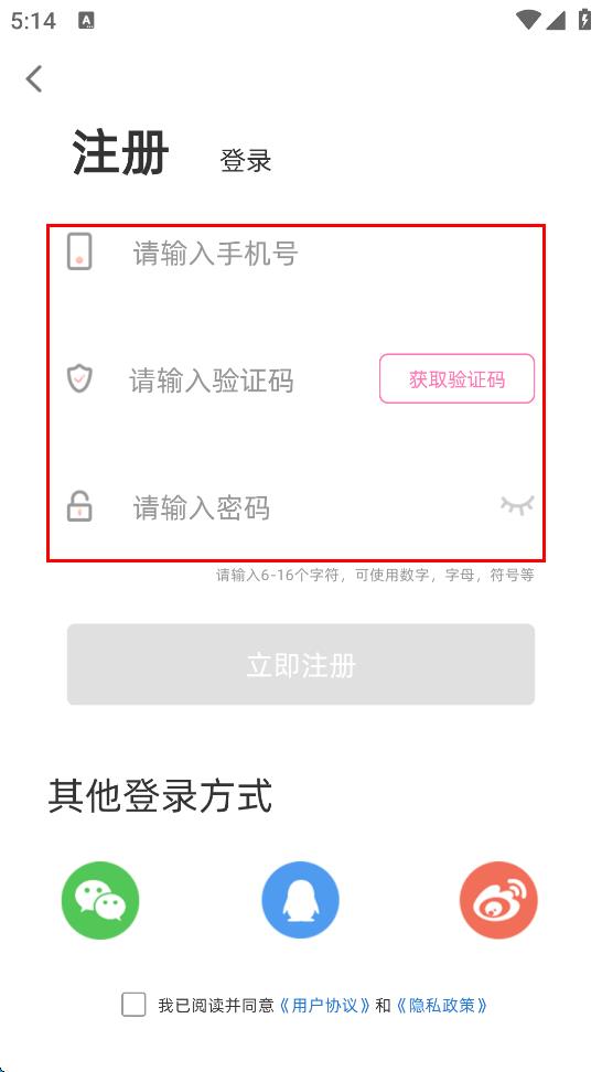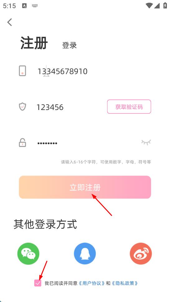 4、勾選我已閱讀并同意用戶協(xié)議和隱私政策,點擊“立即注冊”按鈕,完成手帳類APP賬號注冊操作。