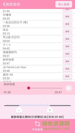 裁剪音頻:可以裁剪歌曲等音頻資源,mp3,flac,m4a格式,支持裁剪音樂成鈴聲等。