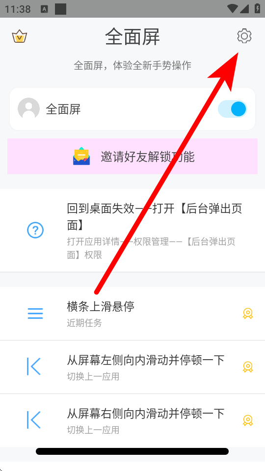 2、進入全面屏應(yīng)用界面后,點擊右上角的設(shè)置圖標(biāo)。