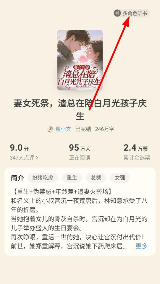 1、打開書旗小說(shuō)APP,在書城或其他頁(yè)面中,找到想聽的小說(shuō),點(diǎn)擊小說(shuō)右上方的聽多角色聽書按鈕,進(jìn)入聽書模式。