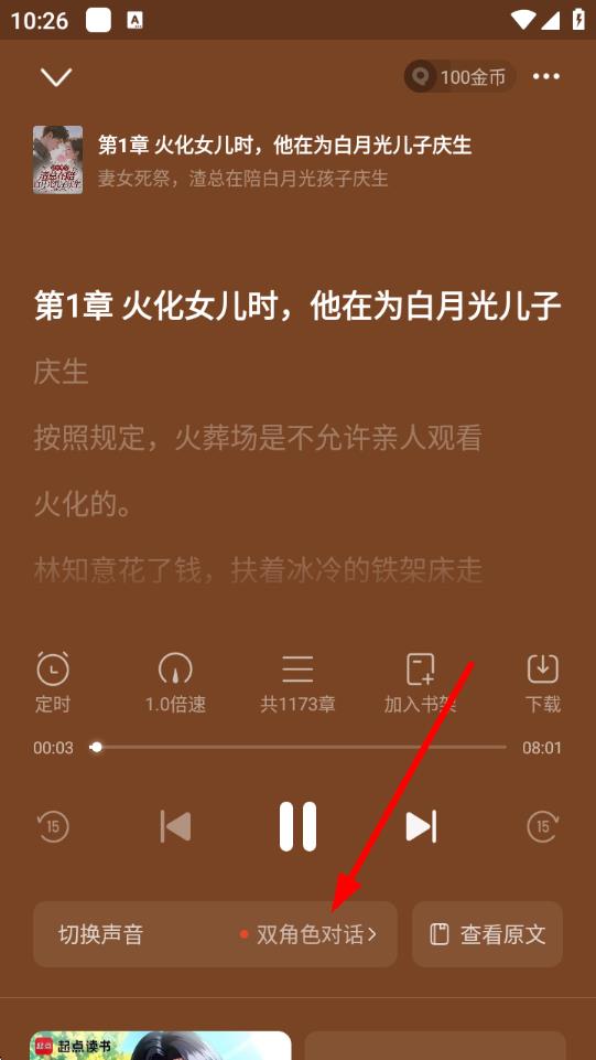 2、進(jìn)入小說(shuō)聽書播放頁(yè)面后,在下方功能欄中,找到并點(diǎn)擊切換聲音選項(xiàng),準(zhǔn)備進(jìn)行語(yǔ)音包的更換操作。