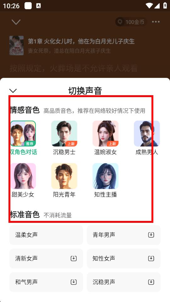 3、點(diǎn)擊切換聲音后,會(huì)彈出切換聲音的界面,在情感音色或標(biāo)準(zhǔn)音色分類下,選擇自己喜歡的語(yǔ)音包,點(diǎn)擊對(duì)應(yīng)語(yǔ)音包即可完成聽書語(yǔ)音包的更改。