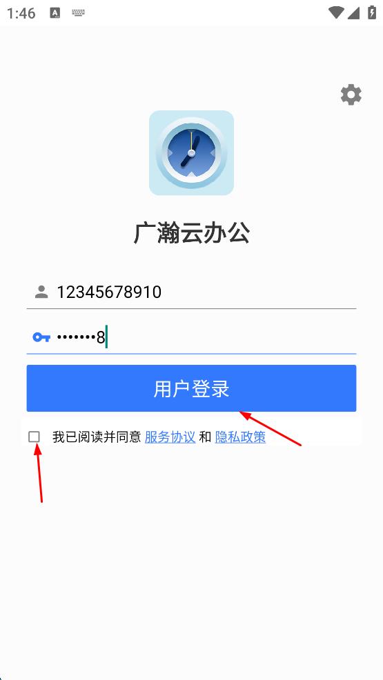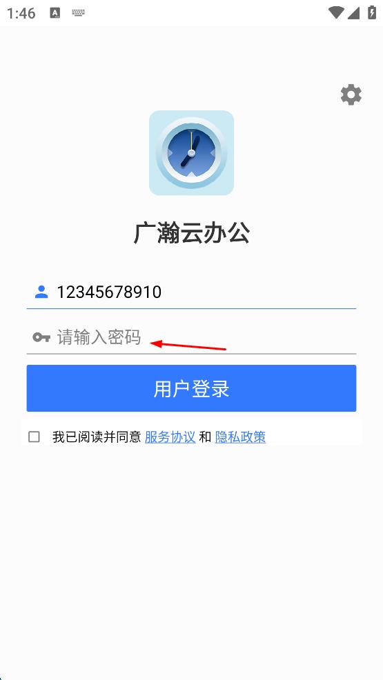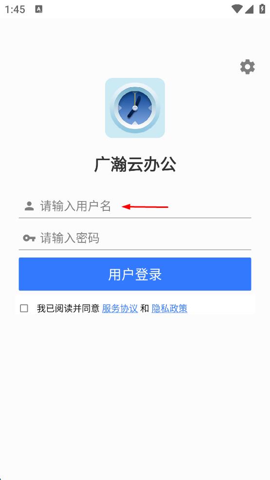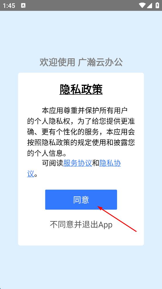 1、打開廣瀚云辦公App,出現(xiàn)隱私政策彈窗,閱讀后點擊同意按鈕。