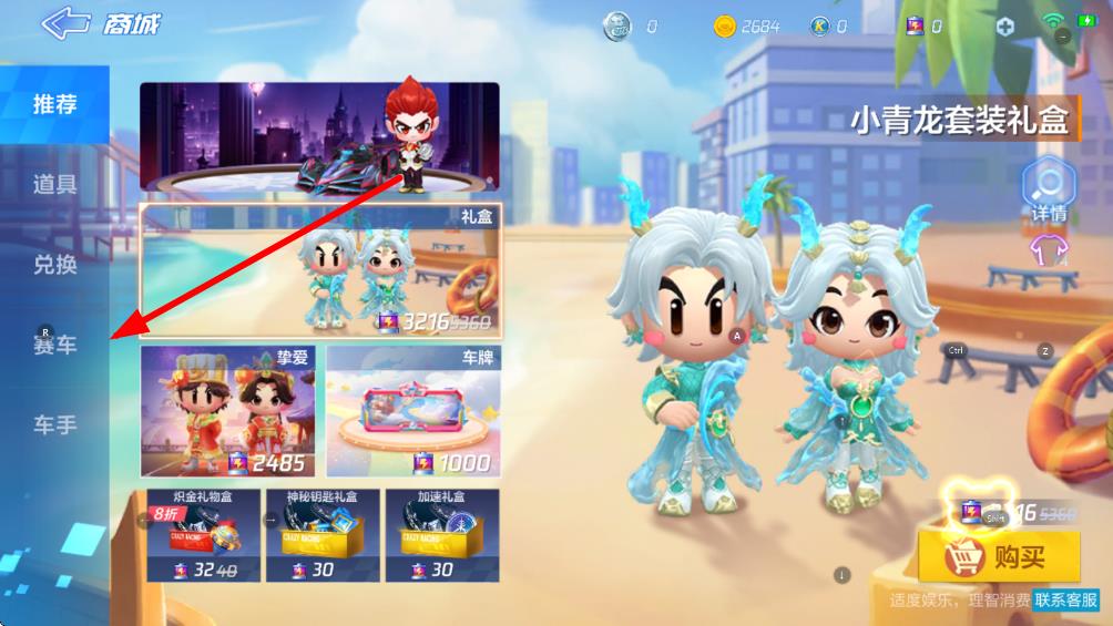 2、在商城頁面左側(cè)導航欄中,點擊賽車選項,瀏覽各種可供購買的賽車。