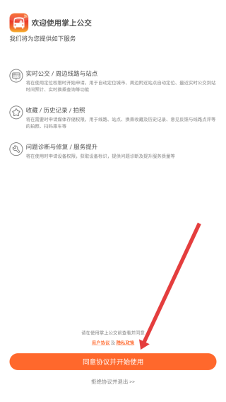 1、在掌上公交權限說明頁,點擊同意協(xié)議并開始使用按鈕,進入城市選擇界面開啟公交查詢流程。