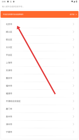 2、在城市選擇列表中點擊北京市,選定所在城市,以獲取該城市的公交實時信息與服務后開始使用。