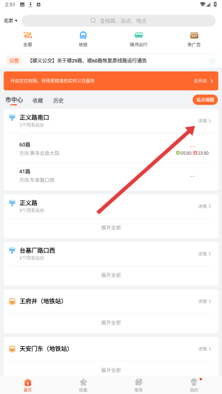3、在公交線路站點列表里,找到目標站點后點擊旁側詳情按鈕,查看公交站點相關信息規(guī)劃出行路線。