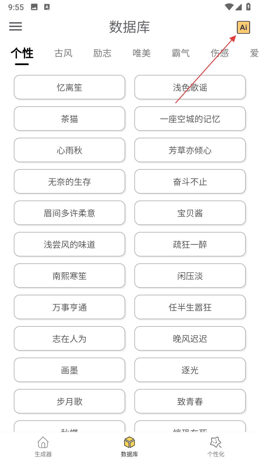 1、打開網(wǎng)名生成器,進(jìn)入數(shù)據(jù)庫頁面,點(diǎn)擊右上角AI按鈕,進(jìn)入AI取名界面。