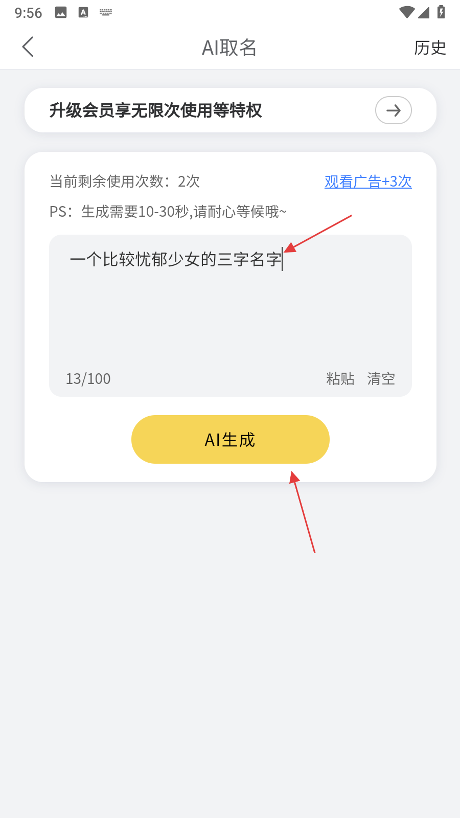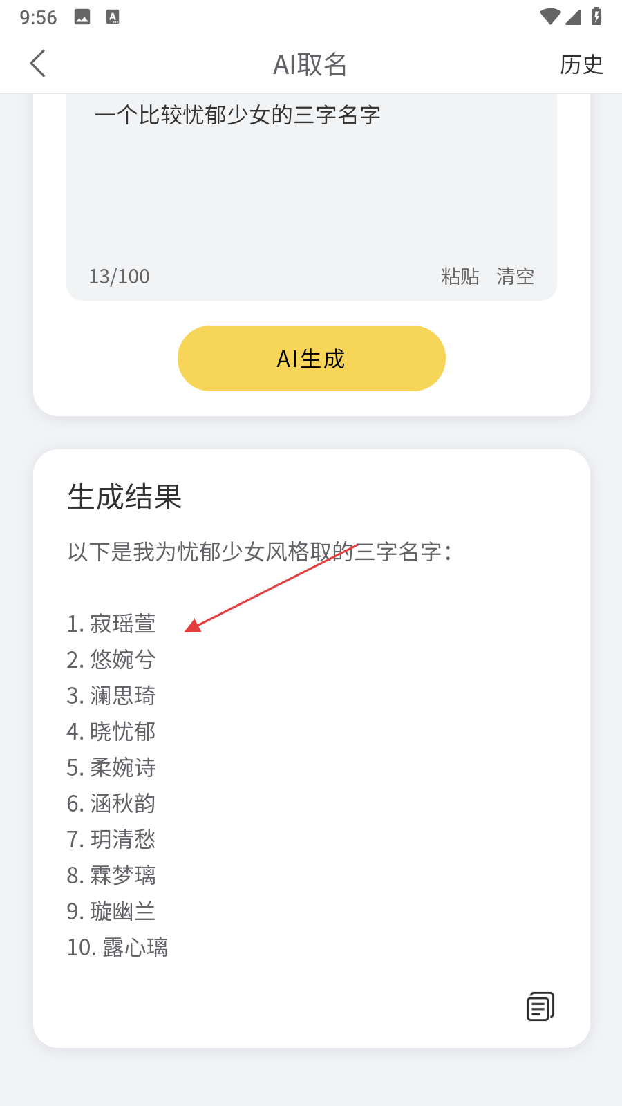 2、在AI取名界面的輸入框中,輸入具體的取名需求,例如一個(gè)比較憂郁少女的三字名字,然后點(diǎn)擊黃色的AI生成按鈕。