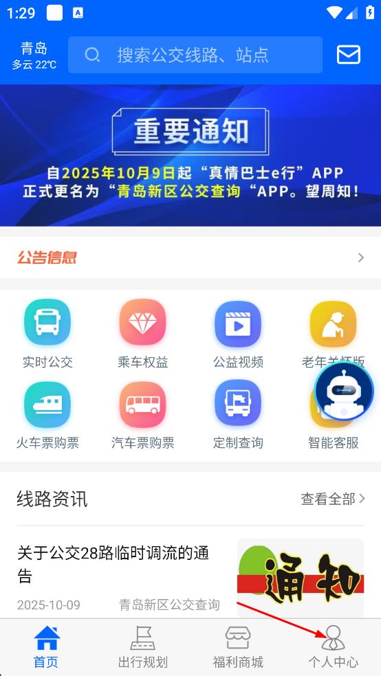 1、打開青島新區(qū)公交查詢軟件,點擊頁面右下角“個人中心”選項,進入個人中心頁面。