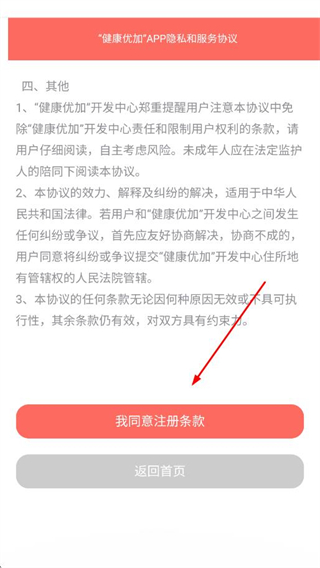 3、在彈出的APP隱私和服務(wù)協(xié)議頁面,點擊我同意注冊條款選項。