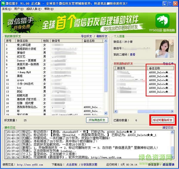 特別是小編發(fā)現(xiàn),微信獵手在找出把你刪除的好友之后,它不會立馬就刪掉她們,而是把她們標記出來,讓用戶自己手動審核刪除,這一點充分避免了軟件誤刪的可能性。
