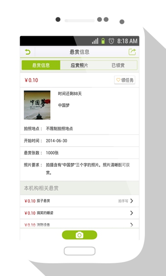 4、企業(yè)用戶可以通過該應(yīng)用發(fā)布懸賞任務(wù);個人用戶拍攝照片來完成應(yīng)賞的任務(wù)。