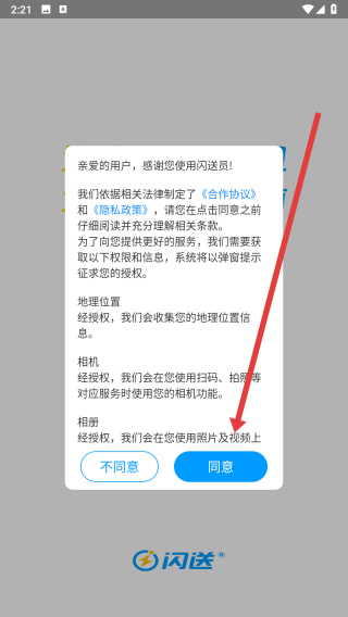 1、在打開(kāi)閃送員app后,通過(guò)點(diǎn)擊彈窗中的同意按鈕,進(jìn)入使用。