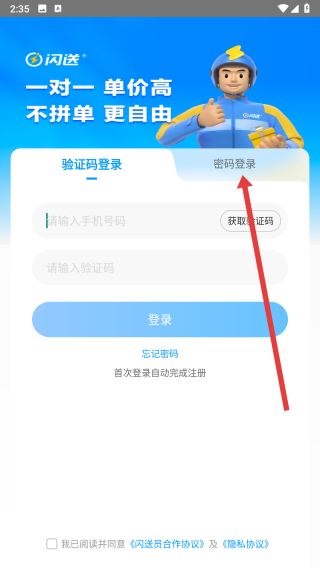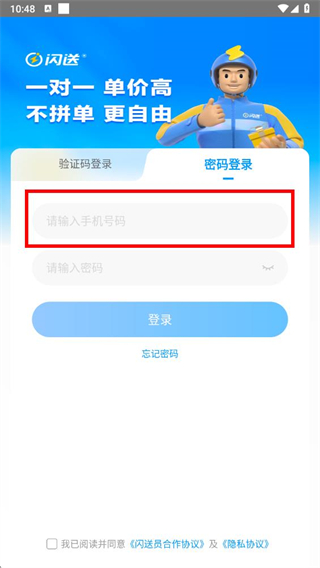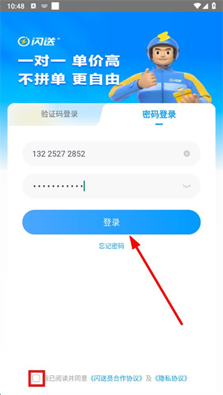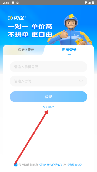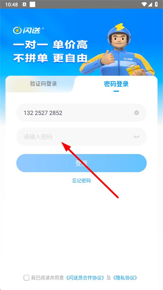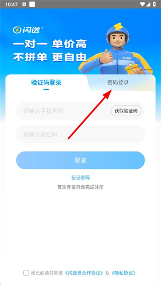 4、勾選我已閱讀并同意閃送員合作協(xié)議及隱私協(xié)議,點(diǎn)擊登錄按鈕,即可完成密碼登錄。