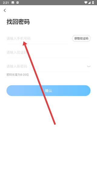 4、跳轉(zhuǎn)到找回密碼頁(yè)面后,點(diǎn)擊輸入框填寫手機(jī)號(hào)獲取驗(yàn)證碼后,完成找回操作。