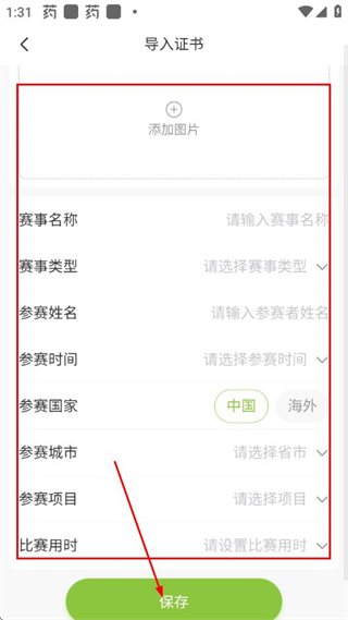 4、在導入證書頁面添加證書圖片、填寫賽事信息后,點擊保存,完成證書上傳。