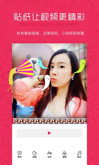 上百款精美動畫貼紙,讓你拍出來的視頻萌萌噠。小貓、小王子、外星人陪你玩轉(zhuǎn)不一樣的視頻!