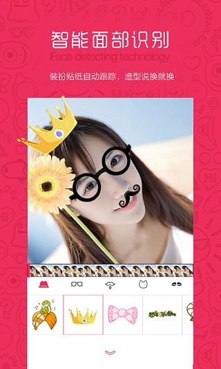 * 人臉智能識別,在自拍同時加入帽子、眼鏡、萌寵等時尚裝扮元素,讓你的自拍更加與眾不同!