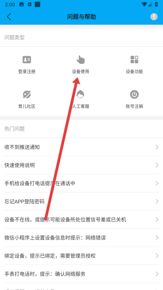 2、在進入到問題與幫助頁面中,可以點擊設備使用選項,進入查看相關(guān)問題與解決方法。