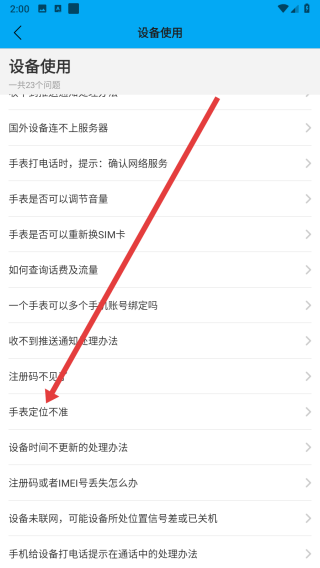 3、在設備使用問題頁面中,下滑找到手表定位不準問題,點擊進入查看解決方法。