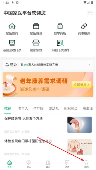 我的:維護(hù)個(gè)人信息和健康檔案,收藏文章和視頻,查看或管理家庭成員健康狀況,聯(lián)系客服等。