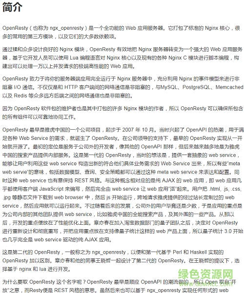openresty最佳實踐是一本關(guān)于openresty平臺的電子圖書,從多個角度接受了openresty的發(fā)展和使用原理,幫助用戶更張的掌握的openresty編程語言,綠色資源網(wǎng)誠意推薦!