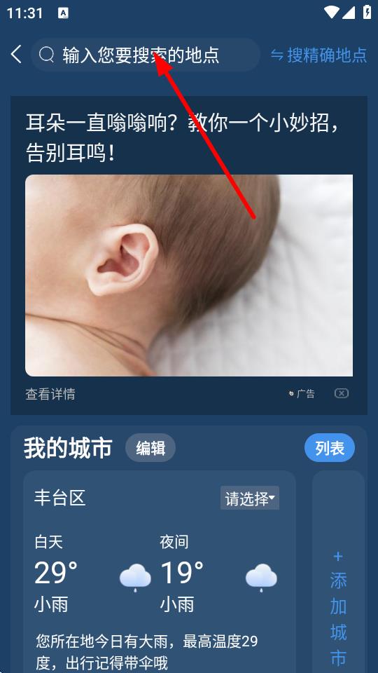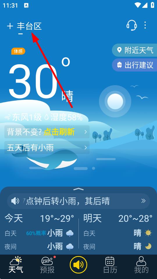 2、在天氣頁面點擊左上方豐臺區(qū),能進入地點相關(guān)操作界面。