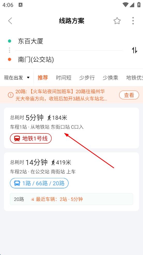 3、在線路方案中,選擇合適的出行方式,如地鐵1號(hào)線或公交,查看總耗時(shí)、步行距離等詳情,確定出行線路。