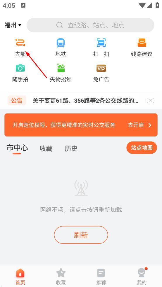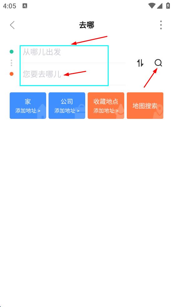 1、打開應(yīng)用后,在首頁(yè)點(diǎn)擊去哪功能,進(jìn)入出發(fā)地與目的地輸入界面,填寫從哪兒出發(fā)和您要去哪兒信息。