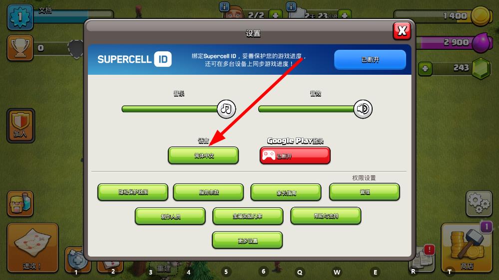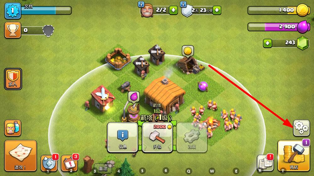1、打開部落沖突游戲,進(jìn)入游戲主界面后點擊右下角齒輪狀設(shè)置按鈕。